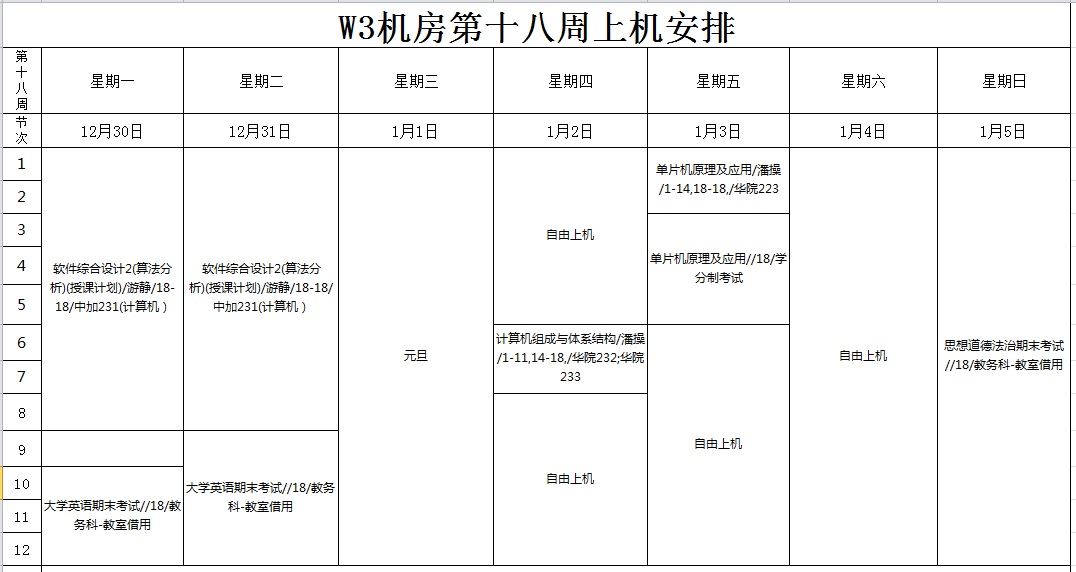 2024-2025学年第一学期W3机房第十八周上机安排(12.30-1.5)