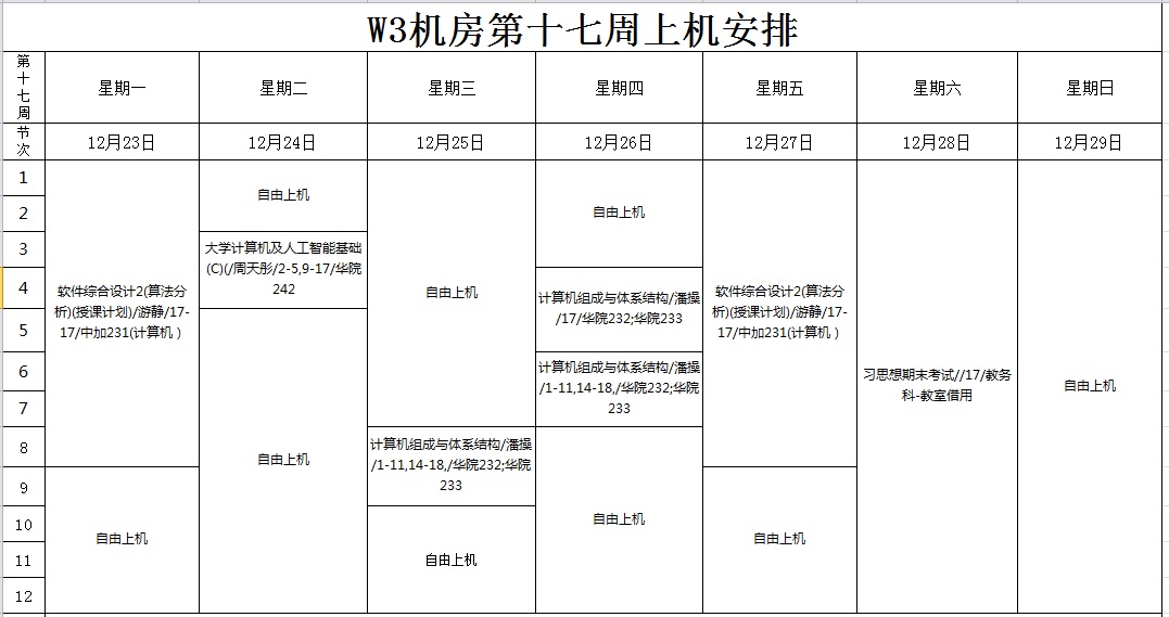 2024-2025学年第一学期W3机房第十七周上机安排(12.23-12.29)