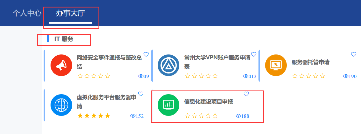 各单位: 根据《常州大学专项资金管理办法》《常州大学信息化建设与管理办法》规定,现开始进行常州大学2026年信息化项目预算申报工作。此次申报截止日期2025年11月5日,请各单位根据学校预算编制要求结合工作实际,填报计划2026年进行的新项目。 请各单位填报“信息化建设项目申报”,填报方式如下: 1、登陆一网通办,“办事大厅”→“IT服务”→“信息化建设项目申报”